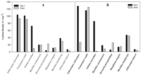 2、 优势种的碳储量在哀牢山亚热带常绿阔叶林碳储量中占有决定作用。在两个研究样地中,优势种木果柯( Lithocarpus xylocarpus )的碳储量分别占样地1、样地2碳储量的30%、50%左右。