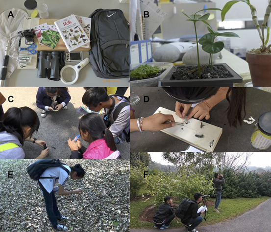 图1 自然观察工具包和四种类型的自然观察活动。(A)自然观察工具包;(B)种子萌发;(C)和(E)动物摄影;(D)制备昆虫标本;(F)观鸟。