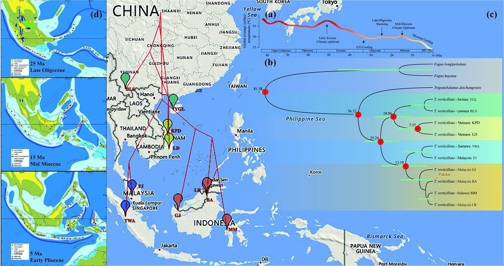 针对这一科学问题,中国科学院西双版纳热带植物园(以下简称“版纳植物园”)综合保护中心植物系统发育与多样性保护研究组的研究人员,以分布于东南亚各岛屿的轮叶三棱栎(Trigonobalanus verticillata)作为研究对象,整合RAD-seq基因组学数据与生态位模型,系统解析了该物种在中南半岛和马来群岛的时空分布格局、遗传多样性结构以及未来潜在分布动态。