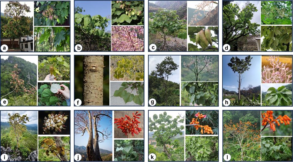 图1. 中国梧桐属植物照片。(a)梧桐属隐存谱系1;(b) 梧桐属隐存谱系2;(c) 云南梧桐;(d) 梧桐(栽培);(e) 龙州梧桐;(f) 丹霞梧桐;(g) 海南梧桐;(h)大围山梧桐;(i) 克式梧桐;(j) 火桐;(k) 美丽火桐;(l) 广西火桐。